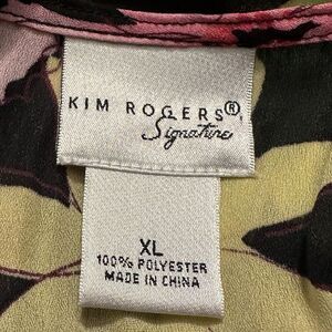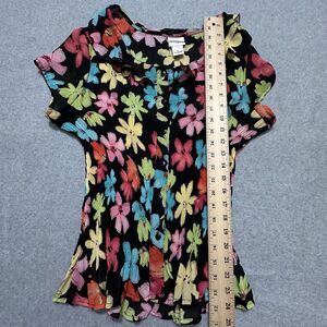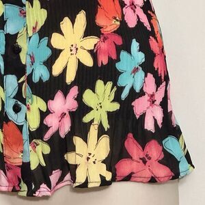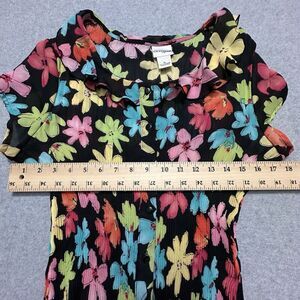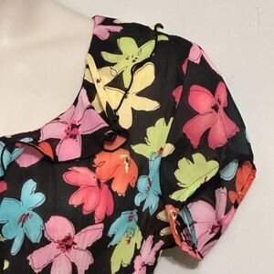 Vintage Funky Women Top XL Black Bright Floral Micro Pleat Crinkle Retro Mod Y2K