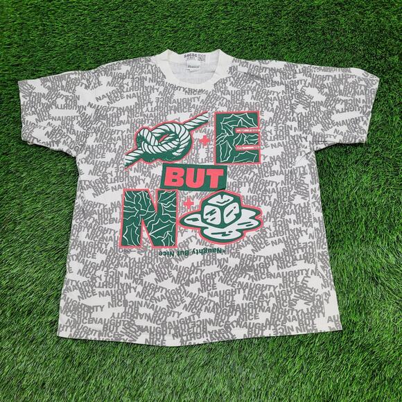 Vintage funny Naughty But Nice AOP shirt, large 21x26, white and gray with rebus graphic design. Classic 90s novelty holiday tee.
