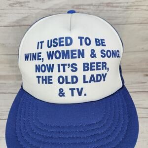 Vintage Funny Trucker Hat Wine Women Song Beer Old Lady T.V. Blue White Snapback.
