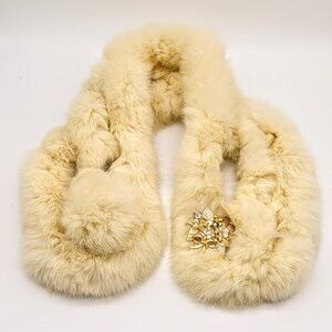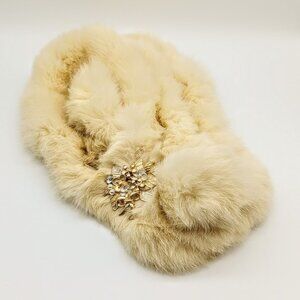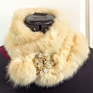 Super soft ivory rabbit fur collar with pearls, rhinestone and brushed matte gold-finish enamel floral leaf pin brooch.