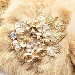Vintage Fur Collar Brushed Matte Gold Pearl Rhinestone Floral Leaf Pin