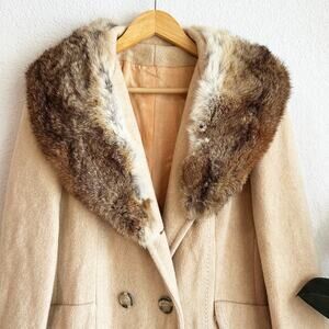 Vintage Fur Trim Wool Trench Coat Medium? Lined Overcoat Double Breasted Tan