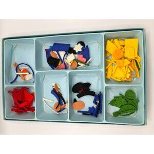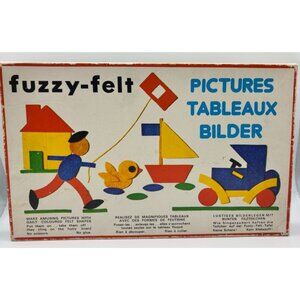 This vintage Fuzzy-Felt set allows for creative play with colorful felt shapes to create imaginative pictures. Suitable for children aged 3 and up.