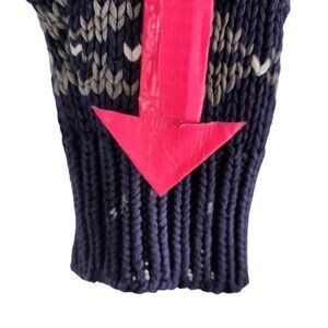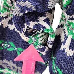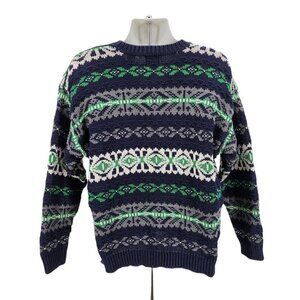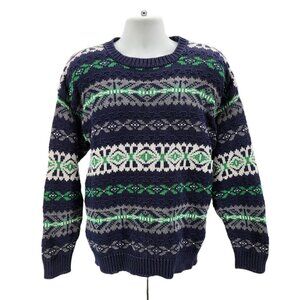 Long sleeve pullover crew neck thick knit sweater - shade of navy blue with a green, white & gray with a Celtic / Nordic like pattern. 100% Cotton. Made in Republic of Ireland. Vintage, retro, 1990's, 2000's, Nineties