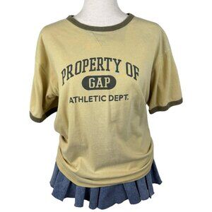 Vintage GAP “Property Of Athletic Dept.” ringer tee in tan with olive green trim. Classic 90s/Y2K athletic style with bold collegiate lettering across the front. Relaxed fit, soft cotton fabric, and retro sporty vibes — perfect for casual streetwear or layering with denim.