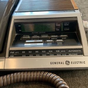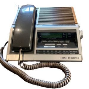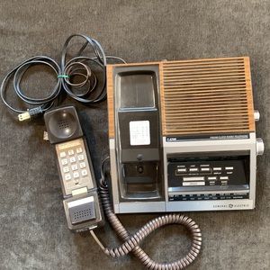 Great vintage condition and still works. Has original cords as well. No damage whatsoever. Really cool dark brown color with wood grain sides. The silver knobs on the side give it a cool touch. Clock is analog with alarm. Fun collectors piece and could always be hooked up to use as a landline. Feel free to ask questions and offers welcome. :)