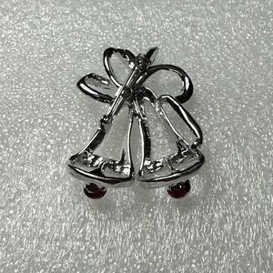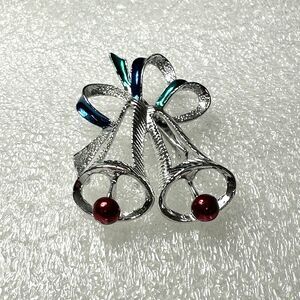 Bright Textured Silver Tone Bells. Bow at top has beautiful, irridescent blue and green accents, and the Bells have a bright red accent.