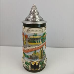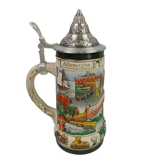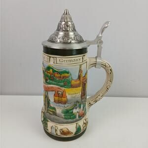 This is a beautiful vintage GERZ beer stein featuring a detailed relief cityscape of Germany with iconic landmarks including Heidelberg, Hamburg, Lübeck, Köln Cathedral, Neuschwanstein Castle, and the Brandenburg Gate. Crafted in Germany between the 1960s–1980s, this stein is made of hand-painted stoneware with a classic pewter lid and ornate molded handle.