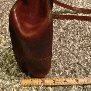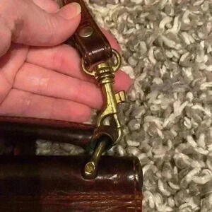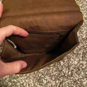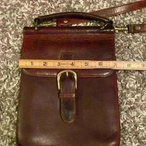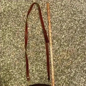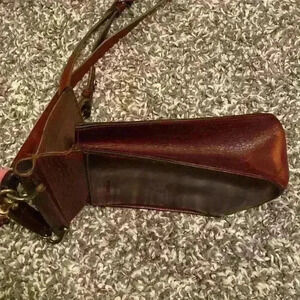 Classic warm brown crossbody bag with long adjustable strap. Buckle enclosure on the front and large pocket on the back, perfect for stashing your phone or wallet. See photos for measurements