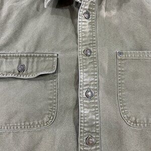 Great Condition with the exception of some fading other than that this shirt is solid fabric with metal buttons. Rivets on one open pocket very cool. Collar is Corderoy. Fabric is heavy demim.