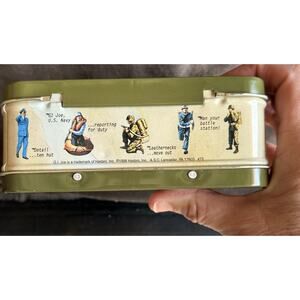 The Vintage G.I. Joe Action Soldier mini metal tin lunch box by Hasbro Inc. from 1998 is a collectible item that appeals to fans of retro military memorabilia and lunchbox collectors. Made of durable metal, this lunch box features the iconic G.I. Joe character, making it a must-have piece for any enthusiast's collection. Its limited release during the 1990s adds to its desirability and value among collectors of vintage military-themed items.