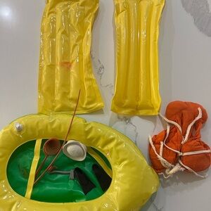 Comes with 2 rafts, boat, life jacket, flippers, sailers hat
