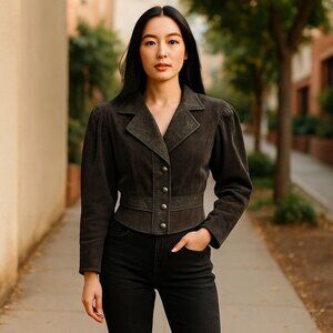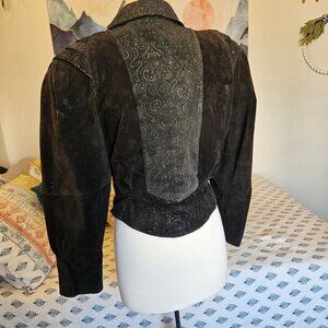 I adore this beautifully rich colored Leather Jacket. It's very retro and perfect for fall or winter. Features a classic black paisley leather, button front, and a cropped fit. Fully lined Leather Jacket that is sure to turn heads. Would be stunning with a black leather skirt or leggings.