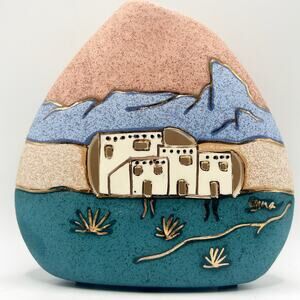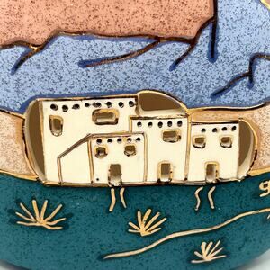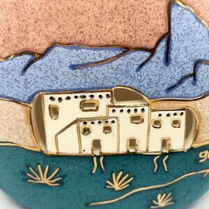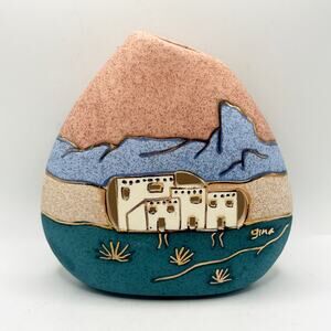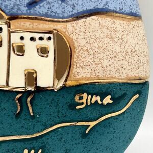 Beautiful Vintage GINA Hand Crafted Native American Pottery piece with 24k Gold trim. This Piece was crafted by the renowned artist Gina and bears her signature. It is hand crafted and painted. It shows a depiction of southwester culture and Mesa buildings. It is in amazing shape and shows no signs of heavy wear such as chips, cracks or breaks. It is sure to make a great addition to anyone's collection