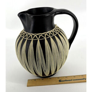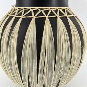 Vintage GMUNDNER KERAMIK Black Stoneware Pitcher Wrapped in Raffia Tribal