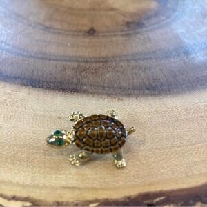 Vintage GOLD-TONE SMALL TURTLE WITH BROWN SHELL AND GREEN EYES BROOCH