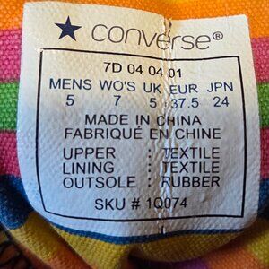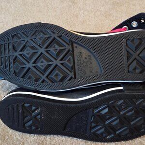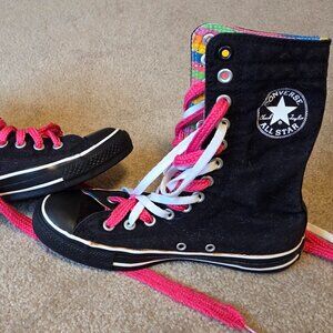 Great condition, 21 year old Black Converse Extra High-top with rainbow inside size 7. These shoes are hardly worn, especially considering their age. They currently come with Pink and White laces, but I can source other colors at request. Since these are an older version of Converse, they are going to wear a lot slower than new Converse.