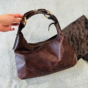 Vintage GUCCI Dark Chocolate Brown Leather Monogram Horsebit Hobo Bag Purse y2k Guccissima GG Signatures Medium LTH