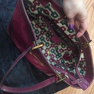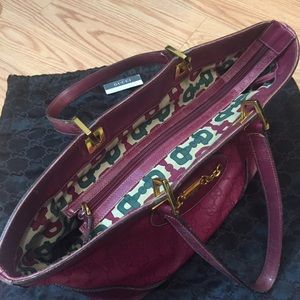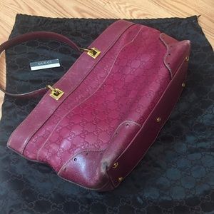 This vintage leather guccissima bag will never go out of style. A dark pink (deep plum / fuschia shade) is beautifully accented with gold hardware. Dual flat shoulder straps. Single zip pocket at interior wall and zip closure at top. There are PLENTY OF visible signs of wear and tear on the bag, specifically the bottom corners, leather trim and straps. Visibly worn out. Comes with original dust bag / controllato card. Bag measures Height: 9". Width: 11.5". Depth: 5.5". Shoulder strap drop: 8.5"