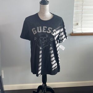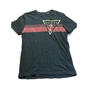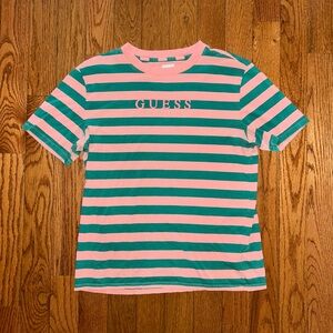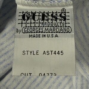 Keywords: Guess Jeans, Georges Marciano, vintage t-shirt, striped tee, embroidered logo, retro style, 90s fashion, menswear, casual top, streetwear, iconic brand, USA made