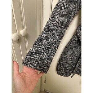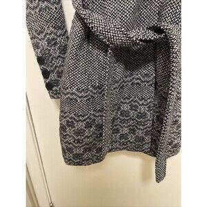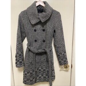 Very nice guess wall blend black and white belted pea coat. Geometric pattern at the bottom half of the coat and sleeves. All buttons intact. No rips or holes. From a smoke free home. The jacket has been well maintained and dry cleaned. Only there is a belt at the waist that can be removed. Measurements are as follows. These measurements are taken with the jacket buttoned up, but the belt not tied. Across the waist approximately 16 inches. Across the shoulders approximately 16 inches. Sleeves measure approximately 22 inches. Overall length from shoulders approximately 32.5 inches.