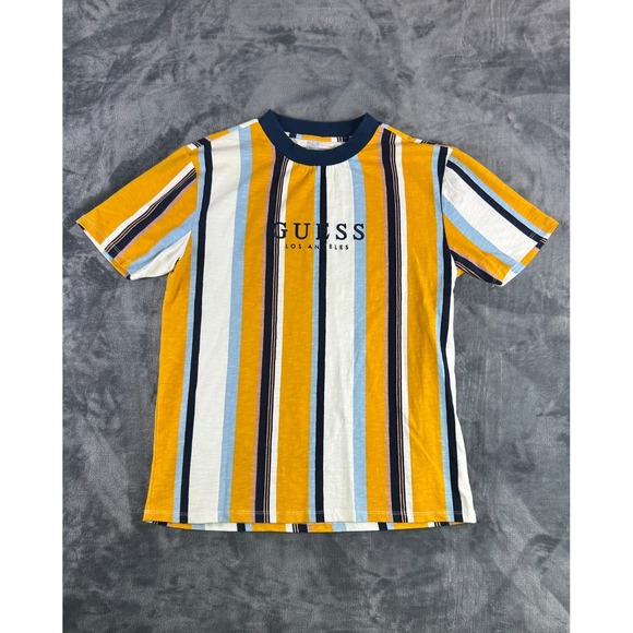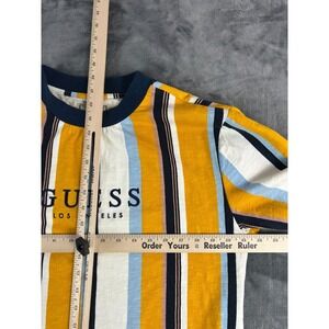 Vintage GUESS Originals Striped T-Shirt Mens Small Yellow Blue White Spell out
