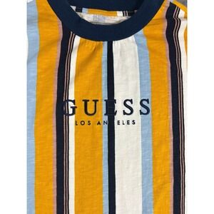 * Multicolor vertical striped design with bold GUESS Los Angeles logo