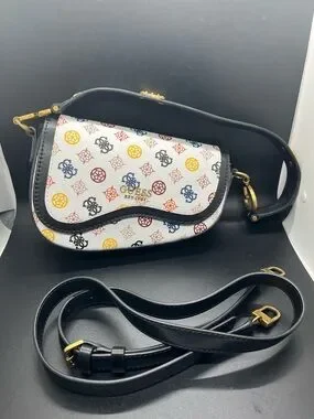 Collectible, vintage, GUESS crossbody bag with white body and multicolor logo pattern. Black trim and adjustable black strap included. Gold-tone hardware accents. Compact curved silhouette for everyday use.