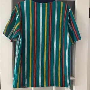 Bold stripes in green, yellow, red, and white. Perfect for casual wear. Comfortable and stylish. Excellent used condition, oversized could fit a medium