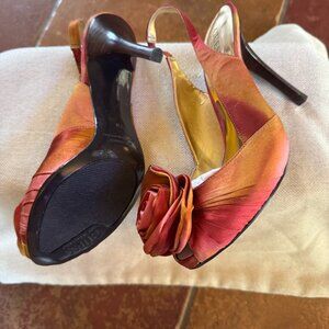 These dramatic satin heels are giving main character energy. A true vintage gem from the early 2000s, these GUESS by Marciano slingbacks are crafted in a luxurious ombré satin that shifts from golden yellow to fiery red and berry pink. A bold rose blossom embellishes the toe, and the gold insole adds a flash of glam. lash of glam. Please note the fabric dye may appear darker in places and this is not a stain. Please refer to the last two photos.