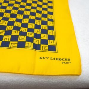 Elevate your style with this vintage Guy Laroche Paris scarf. The blue and yellow checked pattern adds a touch of sophistication to any outfit. Hand wash only to keep the polyester material looking its best. Measuring 23 inches in both length and width, this square scarf is perfect for women who want to stay fashionable in the winter, fall, or spring seasons. This multifunctional scarf can be worn in various ways and is made in the United Kingdom. Get your hands on this timeless accessory that will never go out of style. This scarf is gently used in excellent condition. Measurements: 23" X 23"