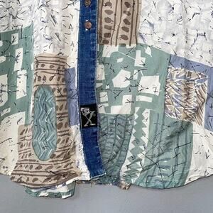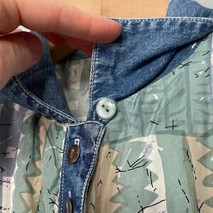 GX short sleeve blues, browns, greens and white print button front silk top with denim trim and pocket in Excellent vintage condition!