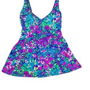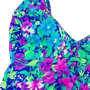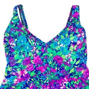 Vintage Gabar One Piece Skirted Swimsuit Size 14 Floral Bright Retro Pink Blue