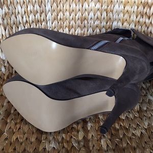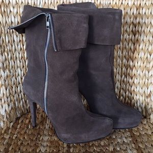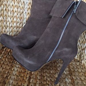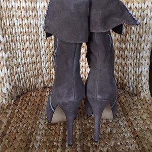 New yet vintage Gabriella Rocha Taupe Suede Mid Calf Boot with silver outside zip. 1.5” Platform at front and a 4.5” Heel. Fold over tops can be worn pulled all the way up if you prefer. Pointed top. Very nice! New in Box but Box is not in great shape. Size 9.5M