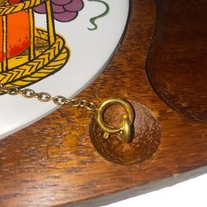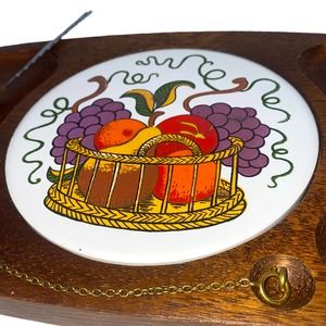 MCM wood and ceramic serving platter in like new condition! Made in the 1960s or 1970s, the platter appears to be untouched and unused for decades. Chained, attached cutting knife is included and can be removed using the spring clasp. Trivets on both sides of the center plate. A round ceramic plate inlay features a fruit basket with grapes, pears, oranges and apples. Made in Japan.
