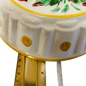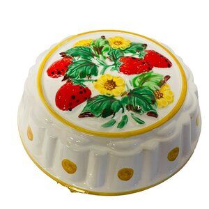 This ceramic jello bunt mold features a colorful strawberry and daisy design. Crafted by Gailstyn-Sutton, it adds a vintage touch to your kitchen decor.