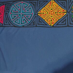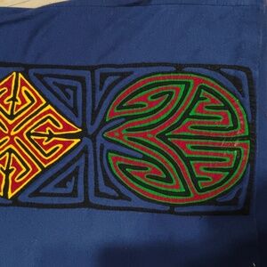 This is a gorgeous vintage top by Galapago for men but I can see a woman wearing as well. It is pre loved but kept in excellent condition almost like brand new. size large. No. call outs at all! measurements lying flat pit to pit 23" length 28". beautiful African/ aztec design mola quilted art work down the entire left side of shirt. and also right sleeve. blue top with all the colors in pics excellent condition