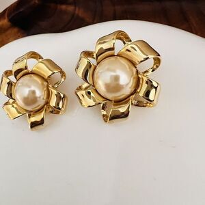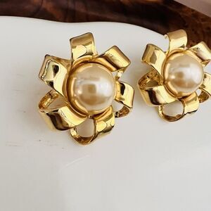 Vintage Galleria Faux Pearl Earrings 3d Abstract Wave Clip On Gold Tone 4610