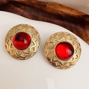 Vintage Galleria Gripoix Glass Earrings Cabochon Clip On Red Gold Tone Round