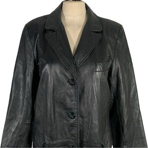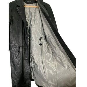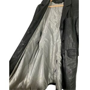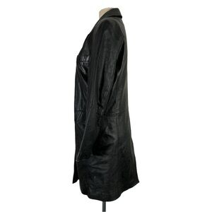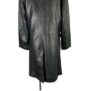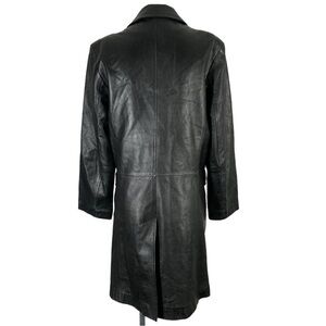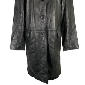 Features: 100% genuine leather. Mid length. Pockets. Notch lapel collared. Pockets. Lined. Button front closure.