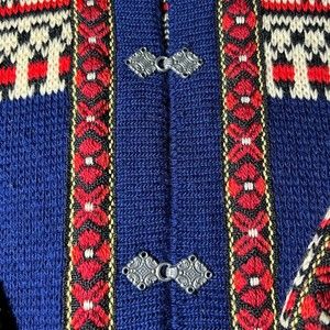 Vintage Gann Sporty Ren Ny Ull Knit Blue Cardigan Sweater Metal Hooks Womens XL