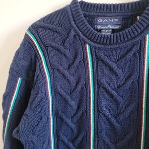This Vintage Gant Men's Sweater in size M features a classic cable knit design with a striped pattern, making it a stylish choice for travel, parties, or casual wear. The sweater is made of cotton and has a crew neck with long sleeves, making it comfortable and versatile for various occasions. With its designer brand and retro 90s vibe, this heavyweight pullover is sure to stand out in any man's wardrobe, perfect for activities like walking, golf, or hiking.