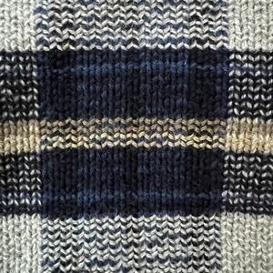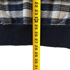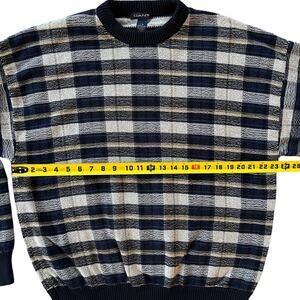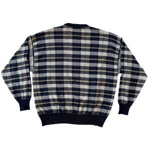 This is a vintage era 1990s to 2000s cozy unisex grandpa sweater. Features a crew neckline, long sleeves, and ribbed cuffs and hem. Mid-weight knit fabric in a blue, black and white plaid design, perfect for layering during cooler seasons. A versatile piece that works for both casual everyday wear and retro inspired styling.