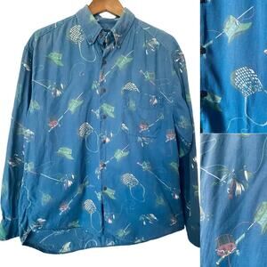 Vintage Gap Fishing Print Button Down Mens Shirt Size Large Rod Reel Tackle Lrg