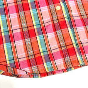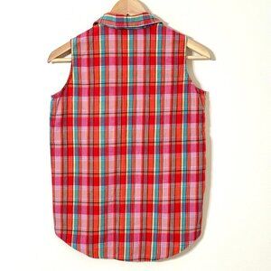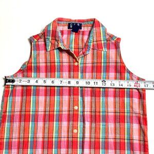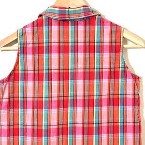 Vintage Gap colorful sleeveless button down shirt in red, pink, teal, and yellow plaid.