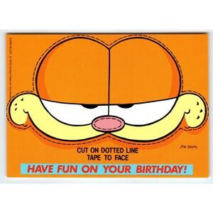 Description: This clever vintage Garfield birthday postcard from 1978 features a large image of Garfield's face with instructions: "CUT ON DOTTED LINE TAPE TO FACE." The caption below reads: "HAVE FUN ON YOUR BIRTHDAY!" The artwork is by Jim Davis. This postcard is unused old stock and is a continental size (approximately 4x6 inches). A unique and interactive collectible, perfect for a Garfield fan's birthday or any vintage humor collection! Published by United Feature Syndicate.