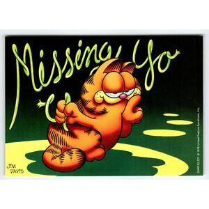 Description: This charming vintage Garfield postcard from 1978 features a thoughtful Garfield with his paw to his chin, with "Missing You" written in a flowing script above him. The artwork is by Jim Davis, set against a dark background with yellow accents. This postcard is unused old stock and is a continental size (approximately 4x6 inches). A sweet and classic Garfield image, perfect for collectors or to send to someone special! Published by United Feature Syndicate.