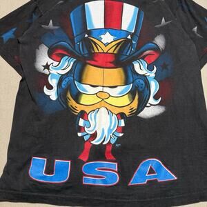 Used in very good condition with some distressing around the collar and a small tip as seen in the last two photos. Otherwise no stains, rips or blemishes of any kind. Screen printed graphic is in excellent condition. This Vintage Garfield "Uncle Sam" USA Double Sided Single Stitch T-Shirt in size Large is a unique and collectible piece of apparel featuring the iconic Garfield character. Made of 100% cotton with a black color, this unisex shirt represents the Garfield franchise and TV show. The shirt is machine washable and comes from the United States, showcasing a cartoon and TV characters theme along with a patriotic Uncle Sam design, perfect for fans of both Garfield and Americana. Measurements are listed below as well as in the photos.