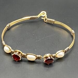 This is a beautiful vintage 14k gold plated wire wrapped bracelet featuring 2 genuine prong set garnets and 3 freshwater pearl beads.