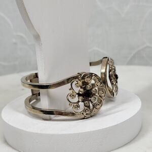 Vintage Garnet Rhinestones Cuff Bracelet Silver Tone Spring Hinged Closure